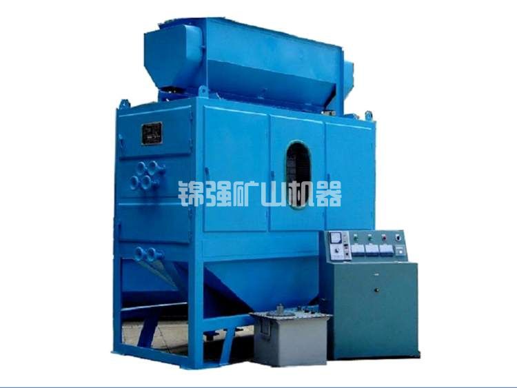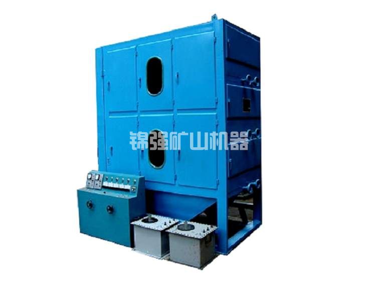 雙輥筒式電選機選用電暈電極庫車電極緊密結(jié)合的復(fù)合型靜電場。當髙壓直流電負電荷(0~22kV)加到電暈電極庫車電極后,工作電壓做到一定標值時,在電暈電極和輥筒(接地裝置正級)中間產(chǎn)生電暈靜電場,因為電暈電極直徑不大(0.3~0.5毫米),進而朝著輥筒方位釋放很多電子器件,這種電子器件又將氣體分子結(jié)構(gòu)水解,產(chǎn)生電暈電流量,共價鍵奔向負級,電子器件、汽體空氣負離子奔向輥筒。因而,挨近輥筒一邊的室內(nèi)空間都帶負電。而靜電極和輥筒中間不充放電。只造成髙壓電場。當被選礦粒經(jīng)干躁加溫后落入輥筒表層并伴隨著輥筒轉(zhuǎn)動而進到電暈靜電場時,電暈電流量使電導(dǎo)體和導(dǎo)電介質(zhì)礦粒都電池充電(濃差極化)獲得負電。電導(dǎo)體礦粒因為頁面電阻器較小,一面電池充電、一面充放電,而導(dǎo)電介質(zhì)礦粒頁面電阻器很大,充放電速率比較慢,因此,礦粒伴隨著輥筒轉(zhuǎn)動離去電暈靜電場進到電場時,電導(dǎo)體礦粒所需的正電荷(剩下正電荷)要比導(dǎo)電介質(zhì)礦粒帶的少。